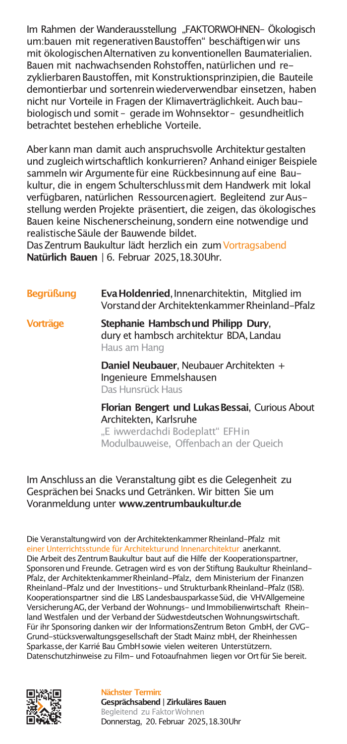 Stephanie Hambsch und Philipp Dury sind eingeladen im Rahmen der Wanderausstellung “Faktor Wohnen – Ökologisch um:bauen mit regenerativen Baustoffen” einen Vortrag über das Haus am Hang in Erlenbach bei Dann zu halten.